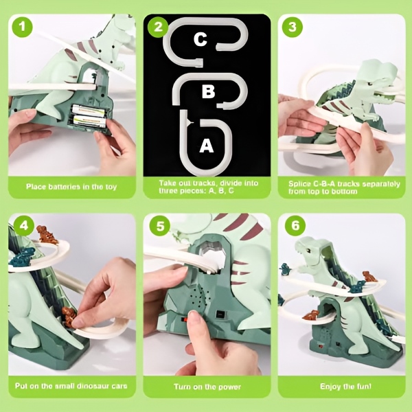 Hergestellt aus Kunststoff mit glatten, abgerundeten Kanten und Schienenverbindungen, damit das kleine Dinosaurierauto sicher durch den Tunnel fährt und Kindern endlosen Spielspaß bietet.