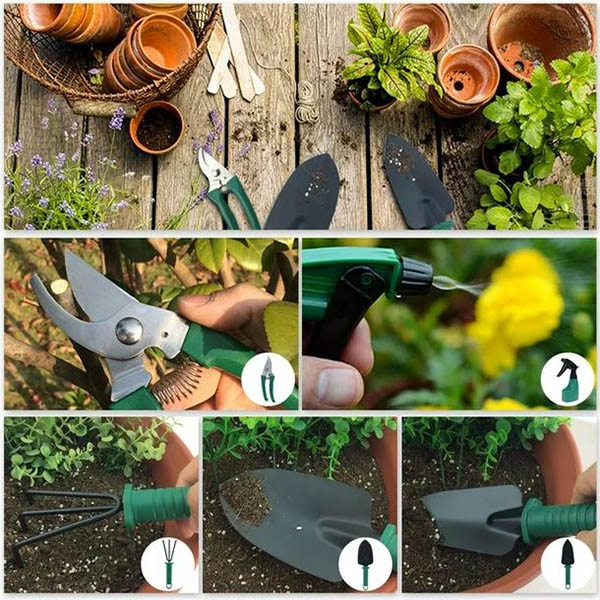 1 x Gartenwerkzeug-Set mit Aufbewahrungsbox: 1 x Unkrautstecher/Rechen, 2 x Pflanzlöffel, 1 x Baumschere, 1 x Zerstäuber.