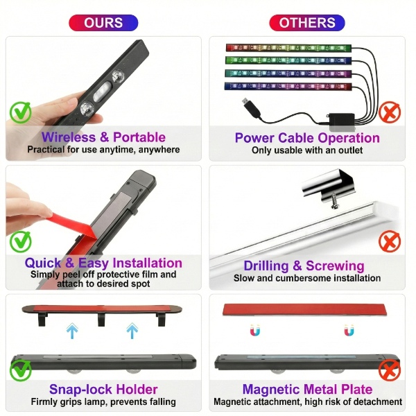 Klebe das Magnetpad auf jede flache Oberfläche, klicke LUMEZIN darauf, verbinde es einmal per USB zum Laden – kein Bohren, keine Verkabelung, kein Handbuchlesen. Der 300-mAh-Akku hält wochenlang mit einer einzigen Ladung und die Speicherfunktion stellt deine letzte Einstellung beim Einschalten sofort wieder her.