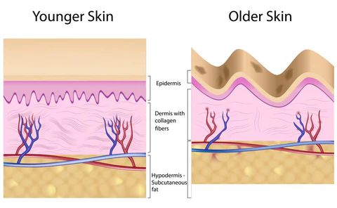Junge Haut hat eine dicke Dermis, die ein reiches Netz aus Kollagen- und Elastinfasern (das Gewebe, das Ihre Haut stützt) enthält. Mit zunehmendem Alter werden die Kollagenfasern spärlicher und beschädigt, so dass sie die Haut nicht mehr so gut halten können. Dies führt zur Erschlaffung und zur Faltenbildung der Haut.