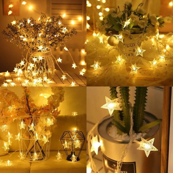 Die LED-Sternenlichterkette lässt sich leicht an Wänden, Fenstern, Türen, Böden, Bäumen, Klavieren, Gärten usw. anbringen oder aufhängen. Sie können sie verwenden, um in Ihrer Lieblingsform und -stil zu dekorieren. Sie eignet sich hervorragend, um das Zimmer eines Kindes oder Jugendlichen oder sogar ein Studentenwohnheim mit einem beruhigenden Farbakzent zu versehen. Sie können sie auch über eine Veranda, eine Tür, ein Fenster, ein Kopfteil oder einen Waschtisch hängen – oder sie als Wanddekoration verwenden.